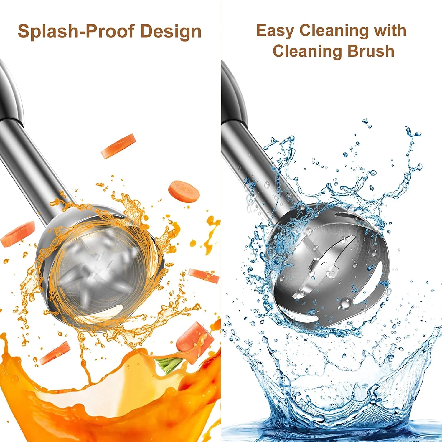 The kitchen hand blender built in full copper motor, which has much better heat dissipation than ordinary motors and has a life span of 200% longer than other motors. Semi-wrapped stainless steel blade guard designed preventing splashing and keeping food from getting stuck